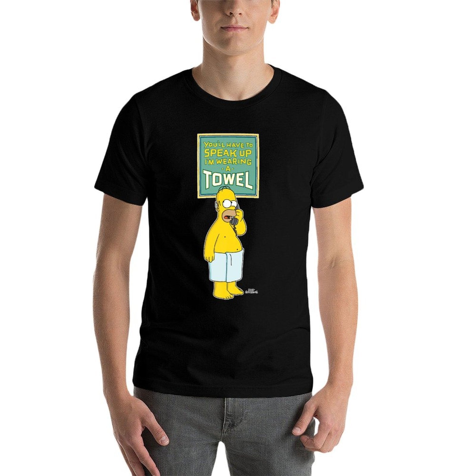 - Avoid bleach to preserve the The Simpsons Homer Simpson Speak Up I’m Wearing A Towel Premium T-shirt’s bold graphics and cotton integrity.