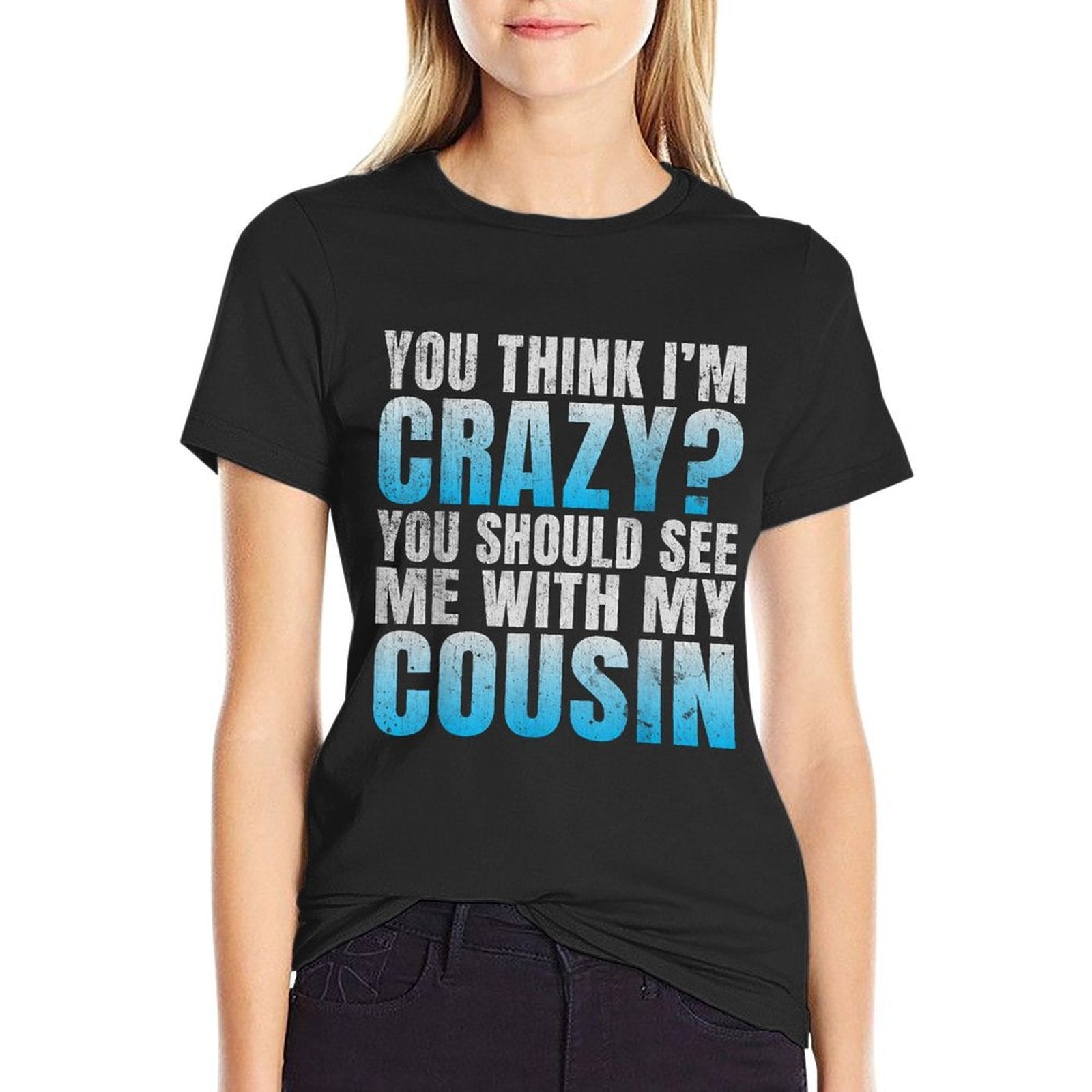 - Avoid bleach to preserve the You Think Im Crazy You Should See Me with My Cousin T-shirt’s bold graphics and cotton integrity.